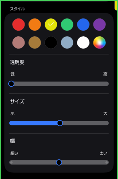 ハンドルの色、透明度、(縦)サイズ、(横)幅の設定ができます。