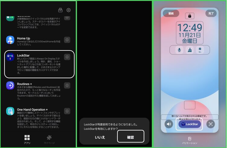 【Good Lock】アプリを開いて「Lockstar」をタップして「確認」をタップすると、ロック画面のスタイルをカスタマイズできる画面の下に「LockStar」のピル型UIが表示されます。タップすると、いろいろなカスタマイズができます。