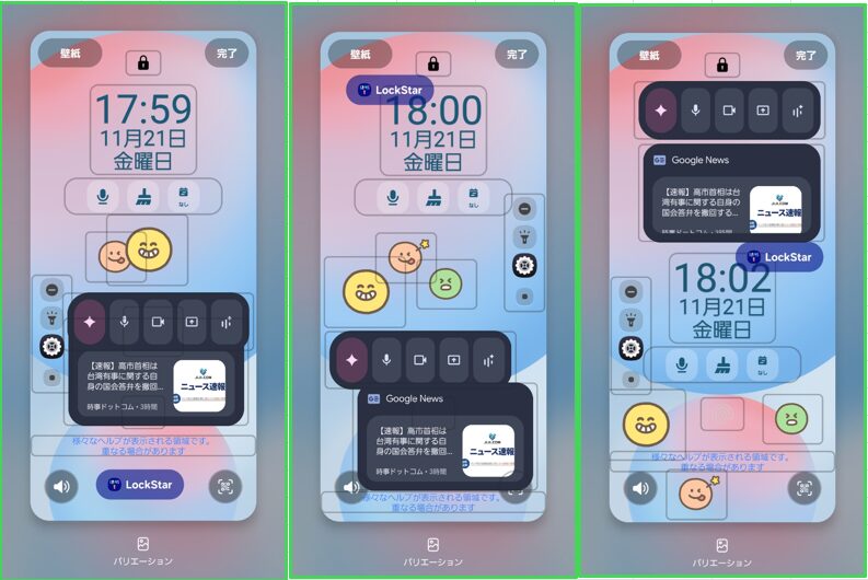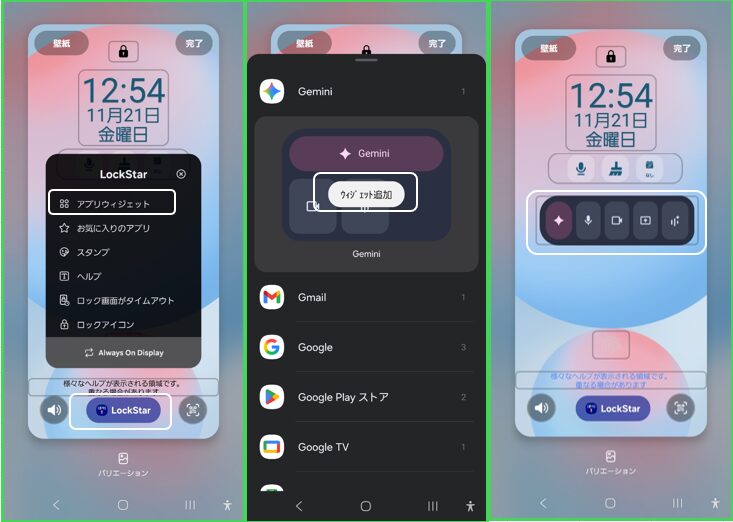 ピル型の「LockStar」ボタンをタップして「アプリウィジェット」をタップすると、ホーム画面に追加できるウィジェットをロック画面にも追加することができます。