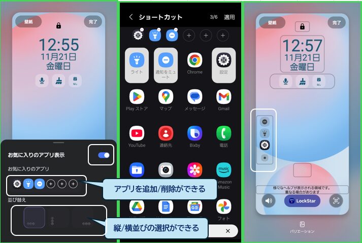 ピル型の「LockStar」ボタンをタップして「お気に入りアプリ」をタップして、「お気に入りアプリ表示」を有効にすると、アプリまたはツールを6つまで追加できます。