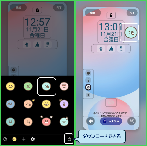 ピル型の「LockStar」ボタンをタップして「スタンプ」をタップすると、ロック画面にいろいろなスタンプを追加することができます。(有料もあります)