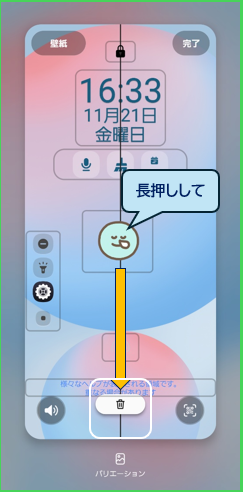 この方法で「削除」できるアイテムは、「アプリウィジェット」と「スタンプ」になります。