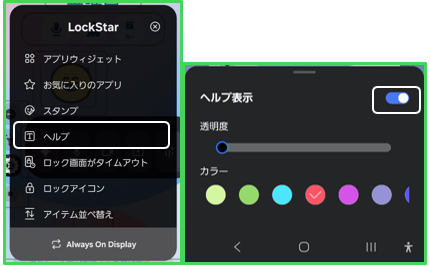 ピル型の「LockStar」ボタンをタップして「ヘルプ」をタップすると、テキスト表示領域(「自分の連絡先情報」やその他「ヘルプ」)におけるテキストの「透明度」「カラー」をカスタマイズできます。また、表示の有無も設定できます。