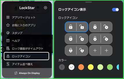 ピル型の「LockStar」ボタンをタップして「ロックアイコン」をタップすると、ロックアイコンの「形状」と「色」のカスタマイズができます。また、表示の有無も設定できます。