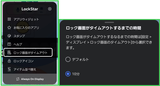 ピル型の「LockStar」ボタンをタップして「ロック画面がタイムアウト」をタップすると、何も操作していないときにロック画面がOFFになるまでの時間を設定できます。