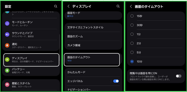 ・〇分:【設定】>【ディスプレイ】>「画面のタイムアウト」で設定している時間になります。