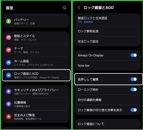※この方法は、設定が必要で、【設定】>【ロック画面とAOD】>「長押しして編集」を有効にします。