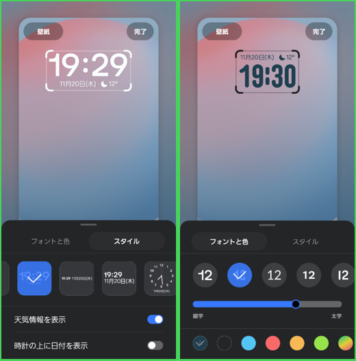 デジタル時計の文字フォント・太字・色のカスタマイズや時計のスタイル(デジタル、アナログ)を選択できます。スタイルによっては、さらに「天気予報」「日付」の表示をオプションで選択できます。