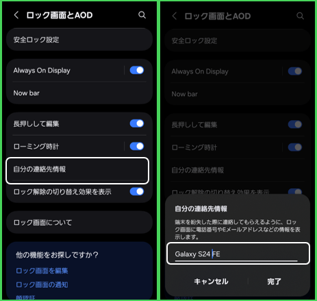 【設定】>【ロック画面とAOD】>「自分の連絡先情報」をタップして、任意のテキストを入力して「完了」をタップします。