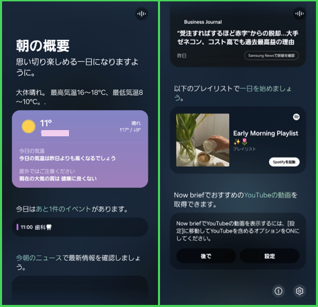 「Now Brief」は、Galaxy AIの新機能で、ユーザーの日常ルーチンをAIが分析し、パーソナライズされた「1日のブリーフィング」を提供します。