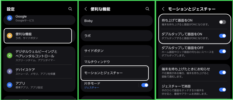 【設定】>【便利な機能】>【モーションとジェスチャー】>「ダブルタップして画面をON」を有効にします。