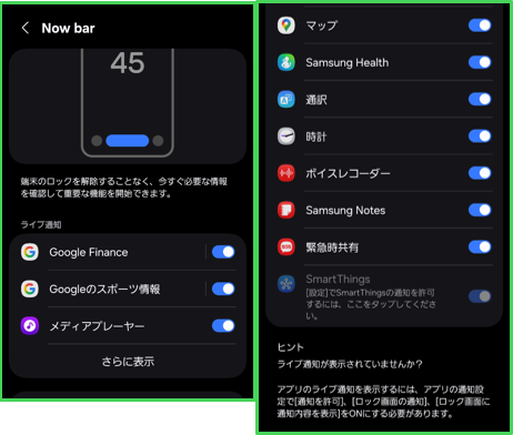 現時点では、「Now Bar」と「ライブ通知」は密接な関係にあり、特定のアプリの「ライブ通知」を無効にすると、「Now Bar」にも表示されなくなります。
