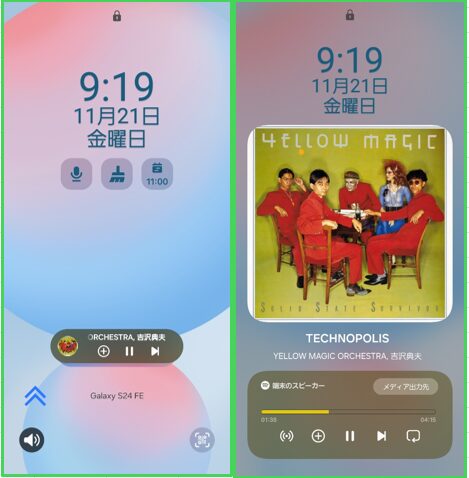 ロック画面の下部に表示される「Now Bar」からも簡単な操作ができますが、タップすると、再生中の曲名やアーティスト名、再生コントロール(再生/一時停止、スキップなど)が表示されて、ロック解除することなく、直接、音楽の操作ができます。