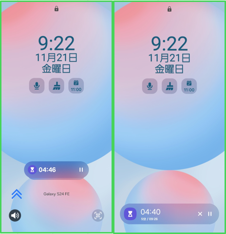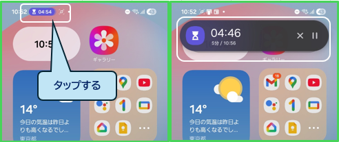 ステータスバーの「Now Bar」では、設定中のタイマーの残り時間を確認できます。タップして、「一時停止」「再開」「停止」の操作ができます。