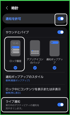 ※ロック画面の「Now Bar」にライブ通知を表示するには、【設定】>【通知】>【ロック画面の通知】>「通知内容を表示」を選択します。