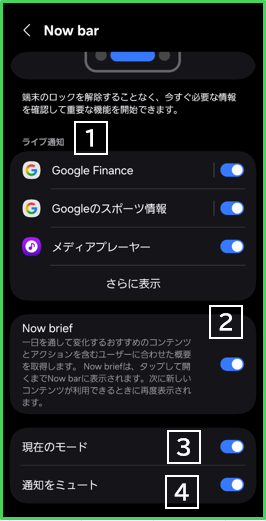 表示できるコンテンツは、「ライブ通知」「Now Brief]「現在のモード」「通知をミュート」になります。