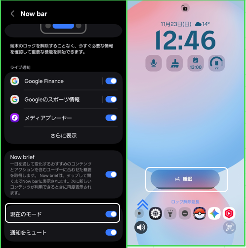 【Now Bar】の設定画面で、「現在のモード」を有効にすると、「モードとルーチン」における「モード」で現時点で有効になっているモードを「Now Bar」に表示することできます。