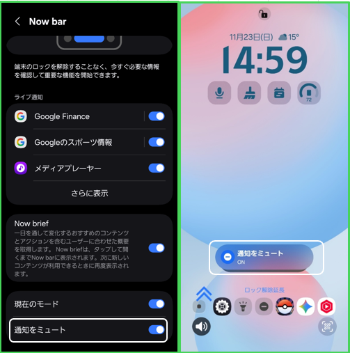 「Now Bar」は、ライブ通知をコンパクトで視覚的に魅力的な形で表示するための特定のUI要素で、ロック画面、Always On Display (AOD)、およびステータスバーの左上などに表示されるピル型のインターフェースのことです。