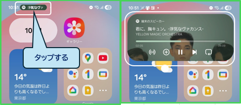 ステータスバーには曲名が表示されます。タップすると、再生中の曲名やアーティスト名、再生コントロール(再生/一時停止、スキップなど)が表示されて、直接、音楽の操作ができます。